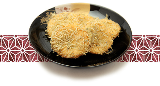 舞阪漁港で水揚げされた鮮度の良いしらすをしらす業者が釜茹でし乾燥させた物を魚肉すりみの衣に1枚づつつけて油で揚げました。表面についたカリッとしたしらすの食感がたまりません。しらすの塩味がくせになる一品です。