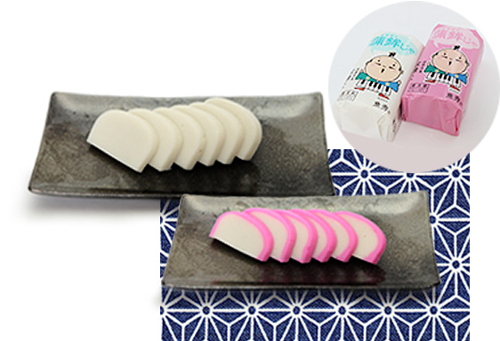 澱粉含有量をできるだけ抑えた歯ごたえのある蒲鉾です。魚肉はタラとグチを使用した猟師の街舞阪風に仕上げました。紅白の2本の蒲鉾は縁起物として内祝いや引き出物などによくご利用いただいております。
